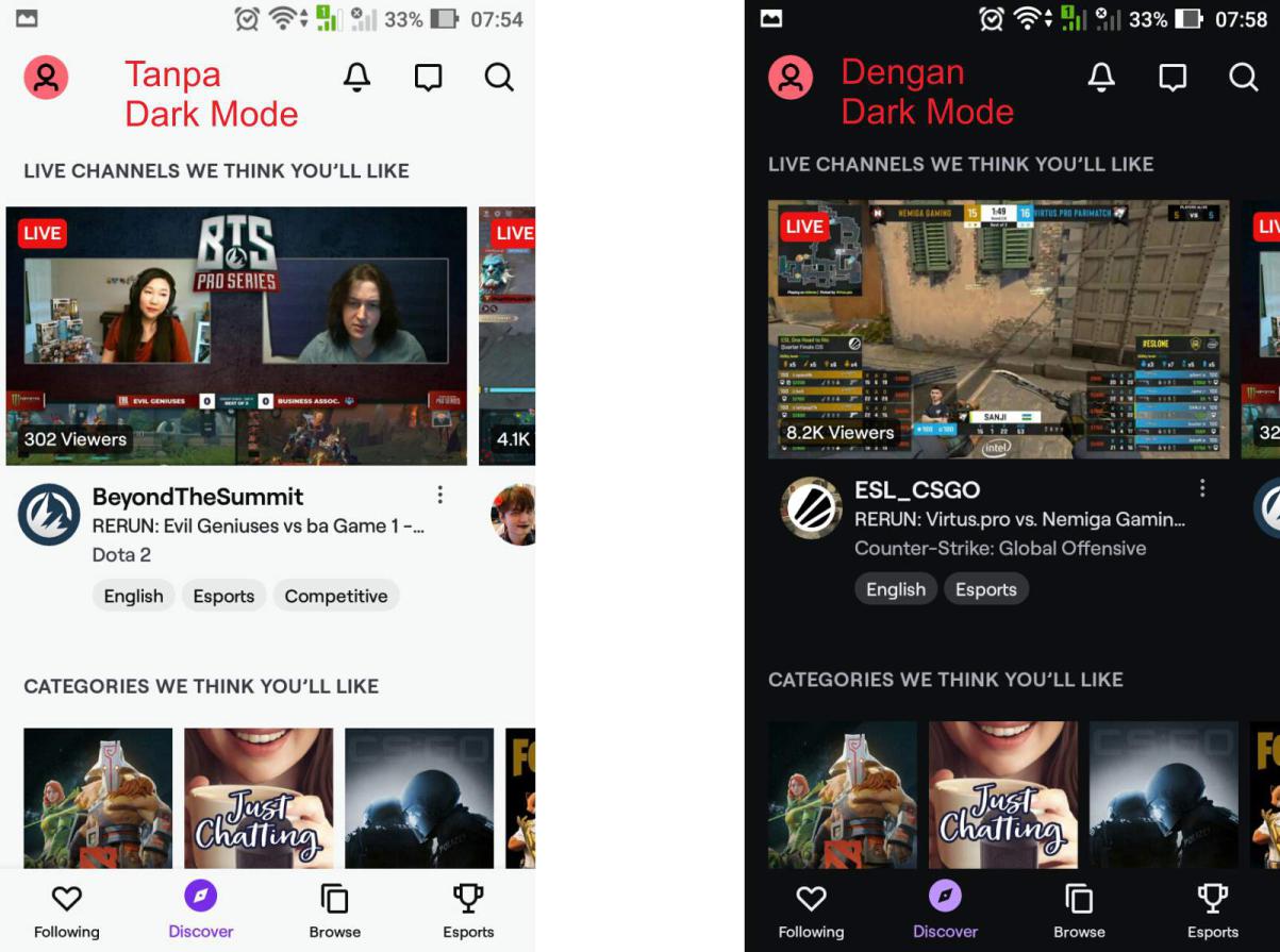 4. Adapun hasilnya dapat dilihat pada gambar di bawah ini. Gambar di bawah menunjukkan halaman aplikasi Twitch dengan dark mode serta halaman aplikasi Twitch yang telah menggunakan fitur dark mode.
