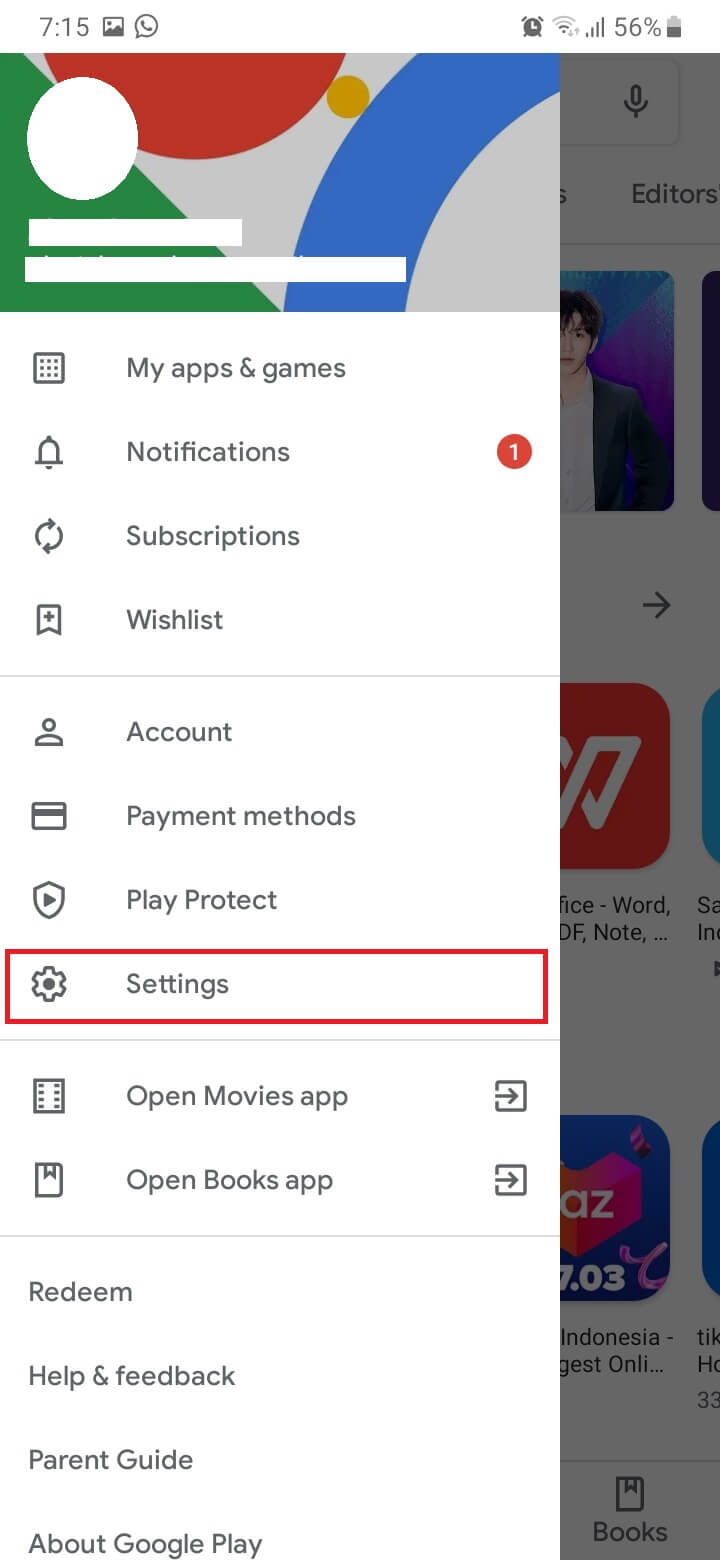 1. Buka aplikasi Google Play Store. Tap icon garis tiga di pojok kiri atas Google Play Store.