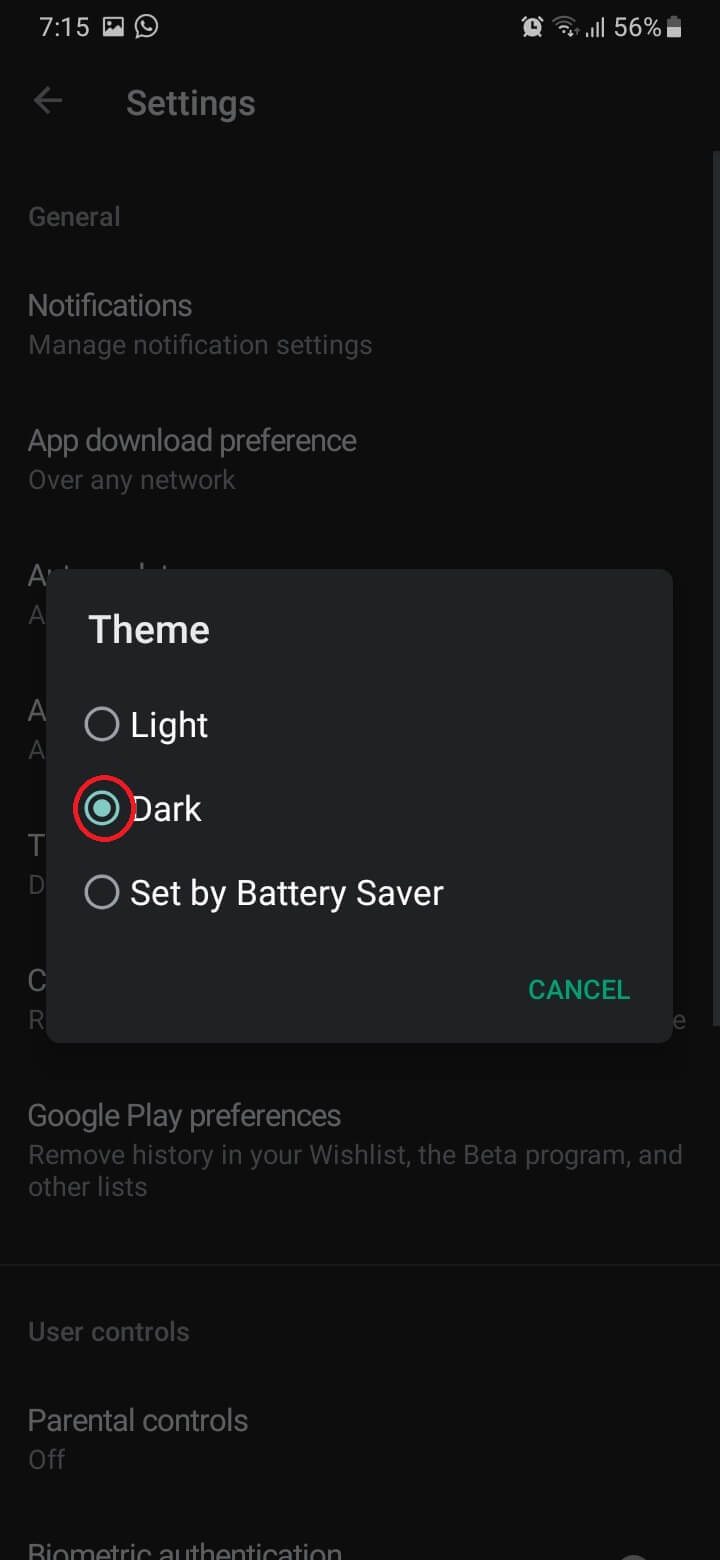 4. Pilih “Dark” untuk memilih tema gelap.
