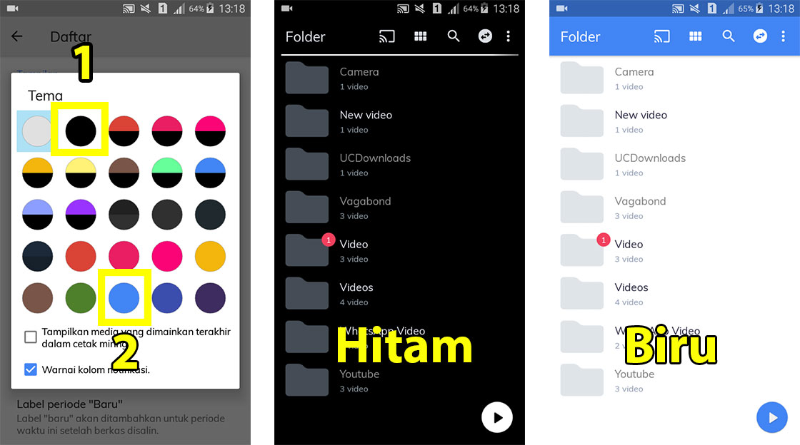 4. Setelah itu, pilih warna tema yang kamu inginkan dan kembali ke tampilan awal aplikasi. Kamu bisa memilih banyak warna tema yang berbeda sesuai keinginan kamu. Kamu juga bisa memberikan tanda centang pada “Tampilan media yang dimainkan terakhir dalam cetak miring” dan “warna kolom notifikasi”.