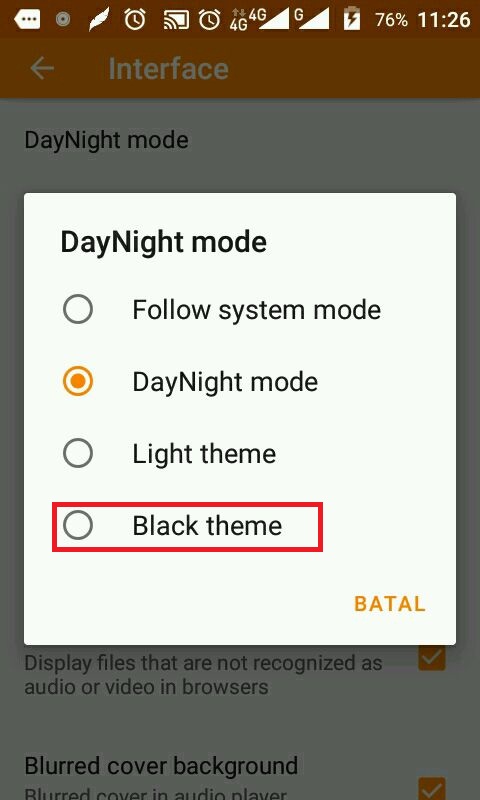 7. Pilihlah Black theme. Tampilan aplikasi tersebut akan berubah menjadi mode gelap secara otomatis.