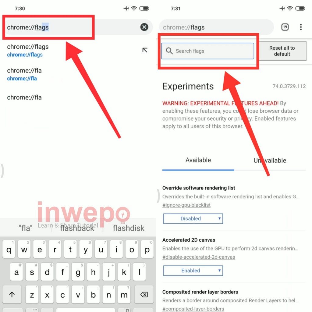 1. Langsung buka aplikasi Google Chrome, lalu pada kolom pencarian ketikan ” chrome://flags “. Selanjutnya jika sudah masuk ke menu Chrome experiment tap pada kolom search dan ketikan ” Ephemeral Tab “.