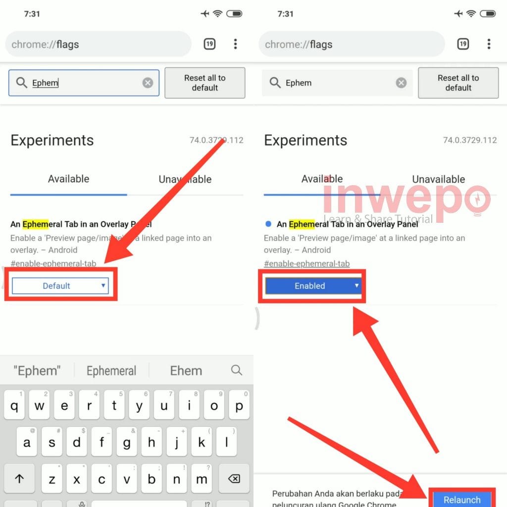 2. Jika menu Ephemeral tab sudah ketemu lanjut tap tombol default dan ubah menjadi Enabled. Berikutnya tap tombol Relaunch Now.