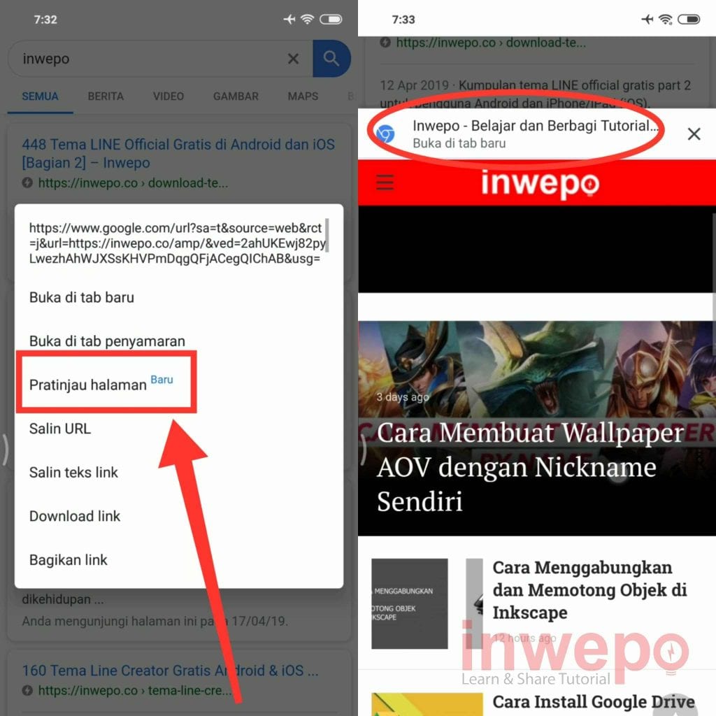 3. Langsung coba cari atau search apa saja di Google Chrome kemudian tap dan tahan pada link yang ingin kamu buka, nanti akan muncul menu baru yakni Pratinjau Halaman. Tap menu tersebut untuk membuka preview laman sebelum masuk langsung ke situs web atau sebuah link.