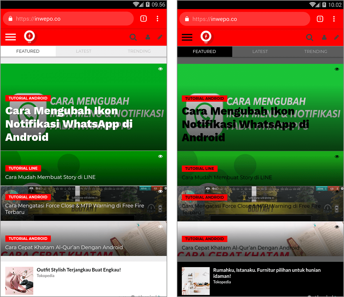 6. Sekarang, silakan buka situs yang ingin kamu kunjungi, dan silakan lihat perbedaannya. Berikut ini contoh perbedaan sebelum dan sesudahĀ web content dark mode diaktifkan.