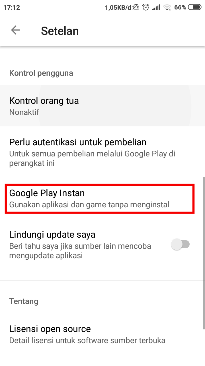 2. Pada halaman Setelan, di bagian Kontrol Pengguna, pilih opsi Google Play Instant.