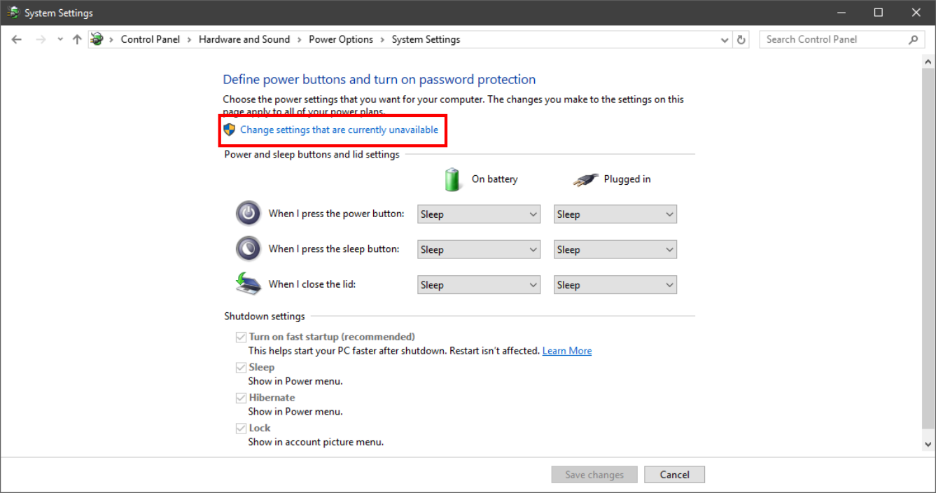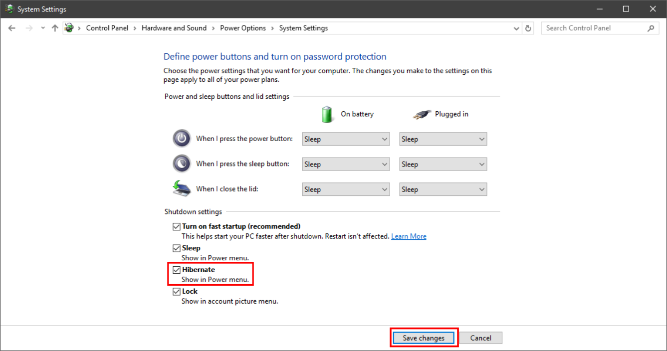 5. Pada bagian Shutdown settings, centang pilihan Hibernate pada kolom yang telah disediakan. Lalu, klik tombol Save Changes.