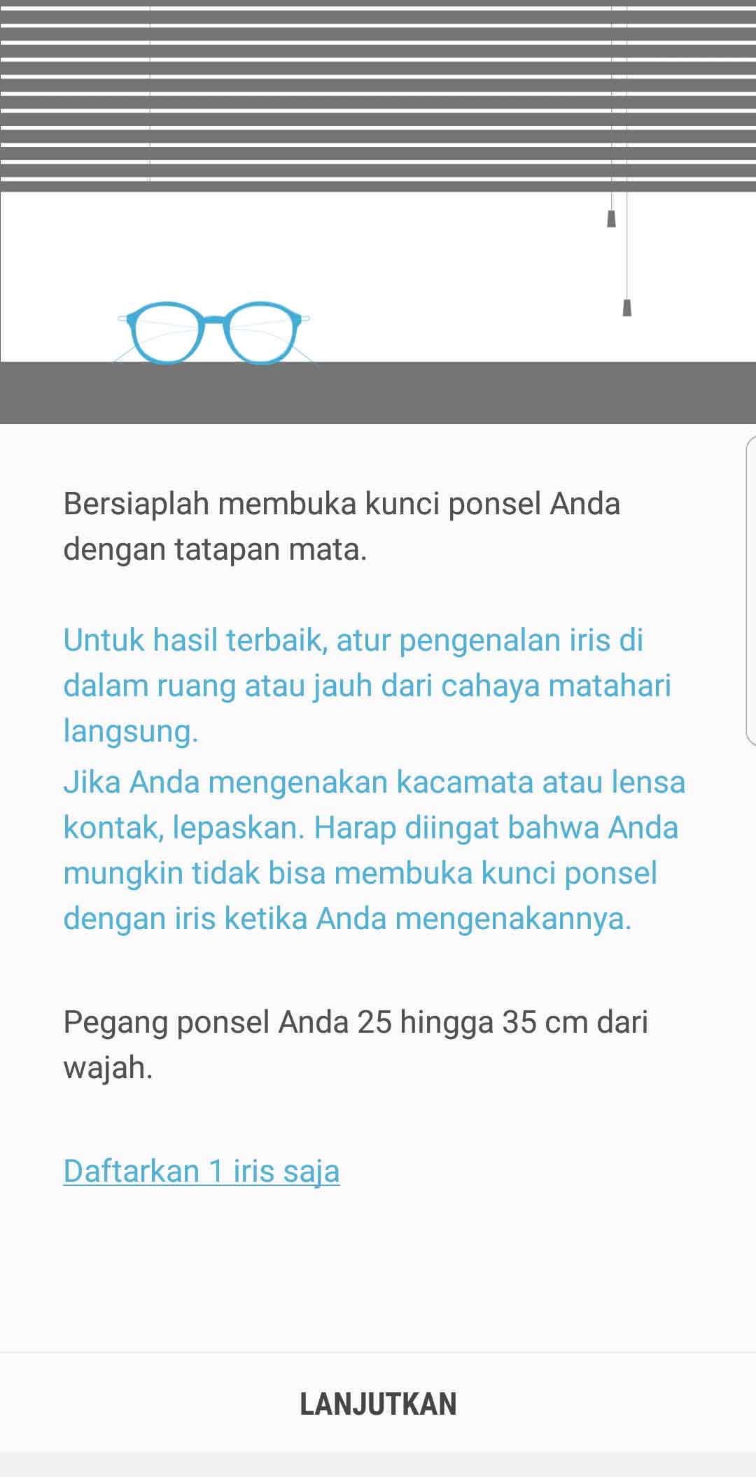 3. Selanjutnya pilih Daftarkan Iris – Lanjutkan. Nanti akan diminta untuk mengarahkan mata ke kamera depan dan agar hasilnya maksimal, harap mengepaskan lingkaran mata pada aplikasi, jarak smartphone dengan mata sekitar 25-35 cm.