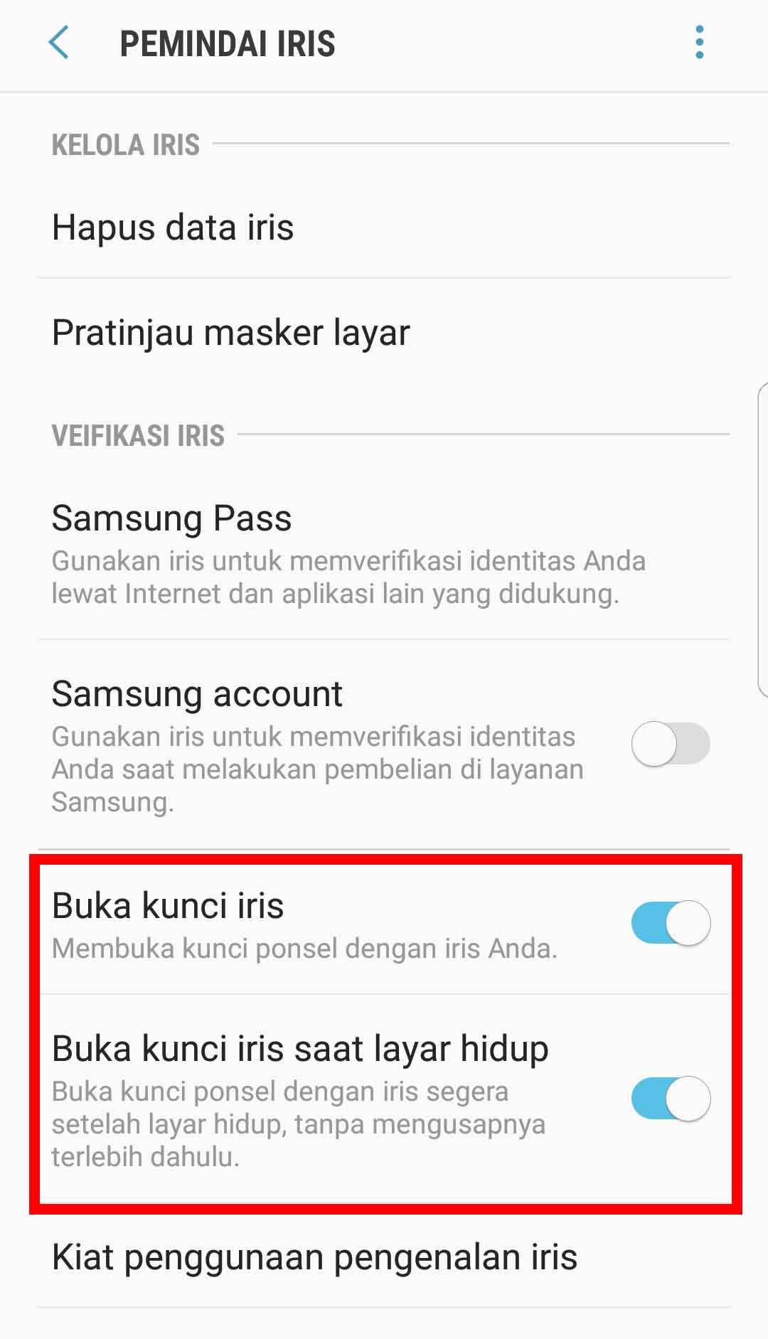 4. Jika sudah, silakan mengaktifkannya pada menu “Buka kunci Iris”, dan “Buka kunci iris saat layar hidup”.