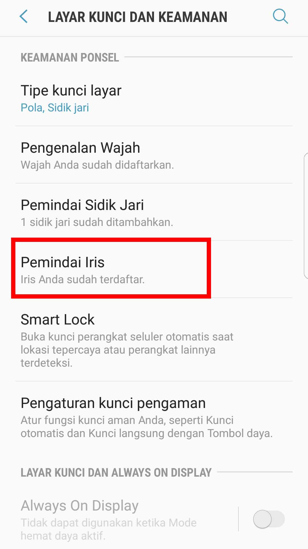 Untuk dapat mengaktifkan fitur Iris Scanning kamu harus menonaktifkan fitur pengenal wajah, karena fitur Iris scanning tidak dapat berjalan 2 sekaligus bersamaan dengan pengenal wajah.