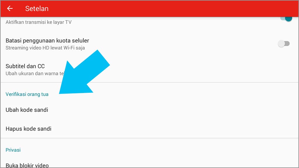 6. Untuk mengubah atau menghapus kode sandi, kamu harus mengetuk ikon gembok – setelan. Setelah itu silakan gulir ke bawah, pengubahan dan penghapusan kode sandi terletak di verifikasi orang tua.