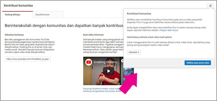 Kontribusi komunitas adalah fitur yang berfungsi untuk mengajak orang lain memberikan subtitel pada video yang kita miliki. Katakanlah kamu membuat video tutorial, dan ingin video tersebut dilihat oleh netizen dunia, maka kamu bisa mengaktifkan fitur kontribusi komunitas.