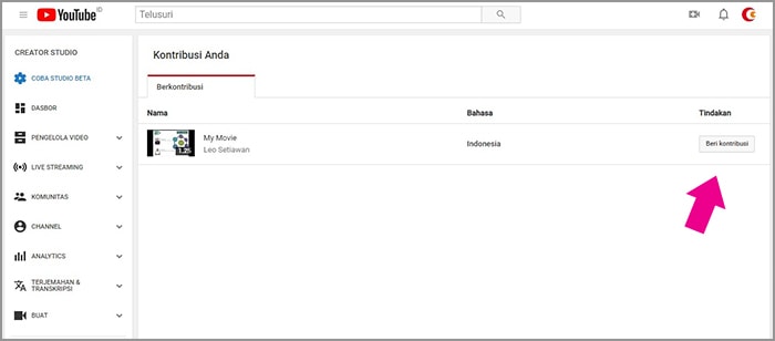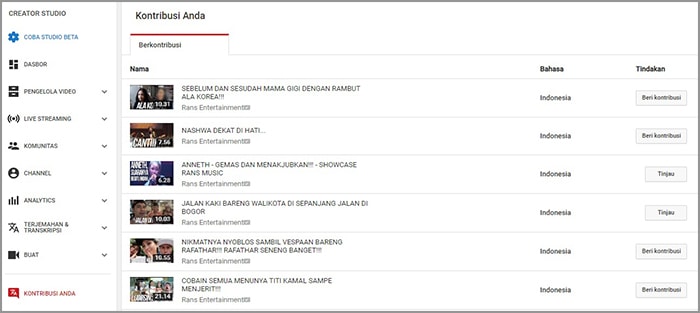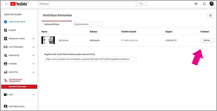 7. Adapun untuk pemilik video, silakan cek kontribusi komunitas setiap hari untuk melihat video apa saja yang sudah diberikan subtitel. Tanda video yang sudah diberikan subtitel akan terdapat keterangan tinjau, sedangkan yang belum diberikan subtitel adalah beri kontribusi.