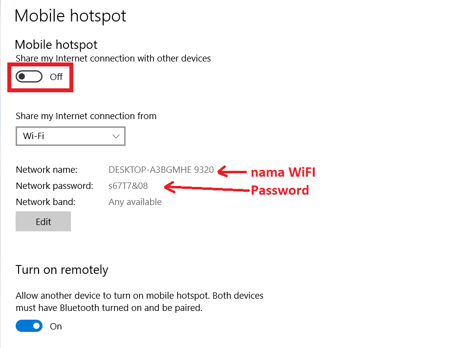 2. Lalu kamu aktifkan hotspot PC / Laptop kamu pada bagian Mobile hotspot, untuk nama dan password dari hotspot tersebut ada di bawahnya.