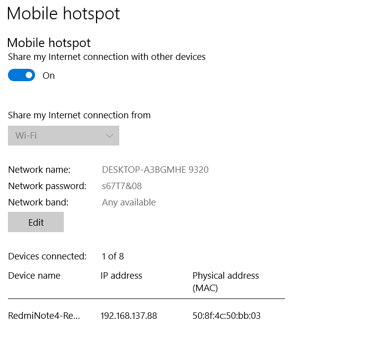 3. Kamu coba hubungkan smartphone kamu dengan Hotspot Windows 10 kamu, jika sudah terhubung maka nama device kamu akan muncul di bawah pengaturan Hotspot tadi, seperti gambar di bawah.