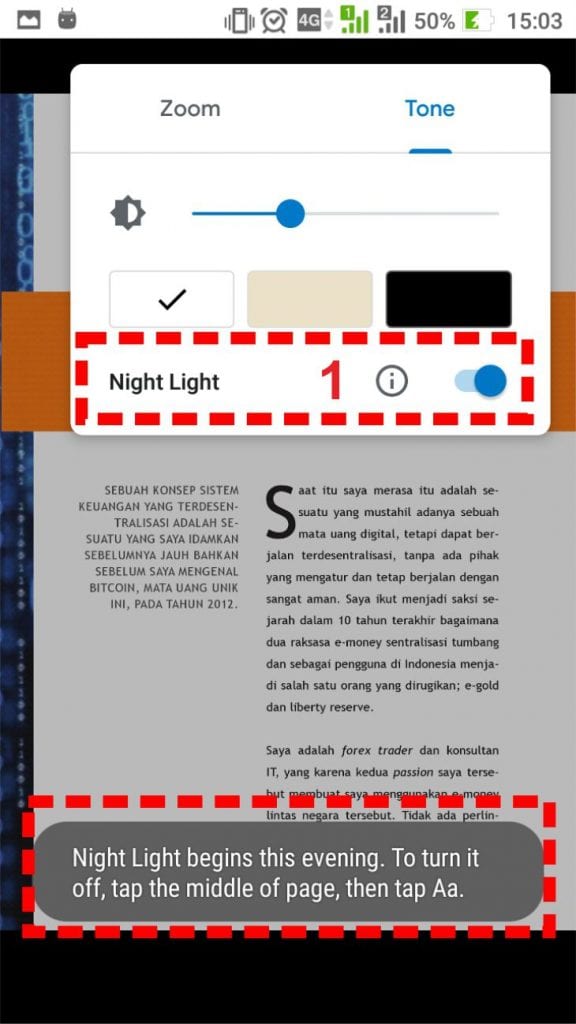 Fitur night light biasanya digunakan pada malam hari yang memungkinkan pembaca untuk membaca buku dengan kondisi minim cahaya biru (blue light). Sehingga mata tidak akan merasa cepat lelah dan membantu kita untuk bisa tidur di malam hari. Kali ini penulis akan membagikan tutorial tentang bagaimana cara mengaktifkan fitur night light di aplikasi google books. Adapun langkah-langkahnya dapat dilihat berikut ini: