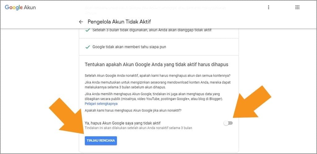 7. Aktifkan hapus akun dengan cara menggeser tombol ke kanan, kemudian klik tinjau rencana.