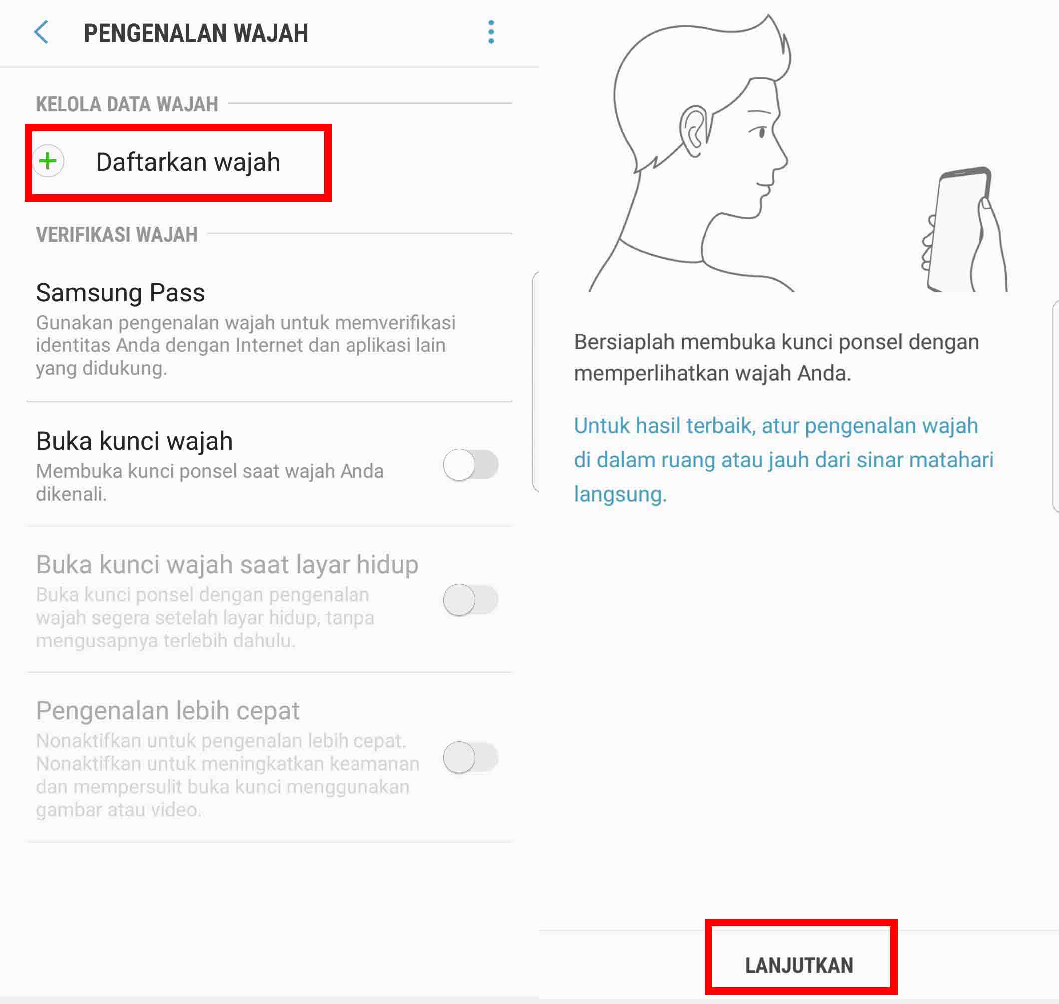 3. Selanjutnya pilih Daftarkan wajah – Lanjutkan. Nanti akan diminta untuk mengarahkan wajah ke kamera depan dan silakan mengepaskan lingkaran wajah pada aplikasi.