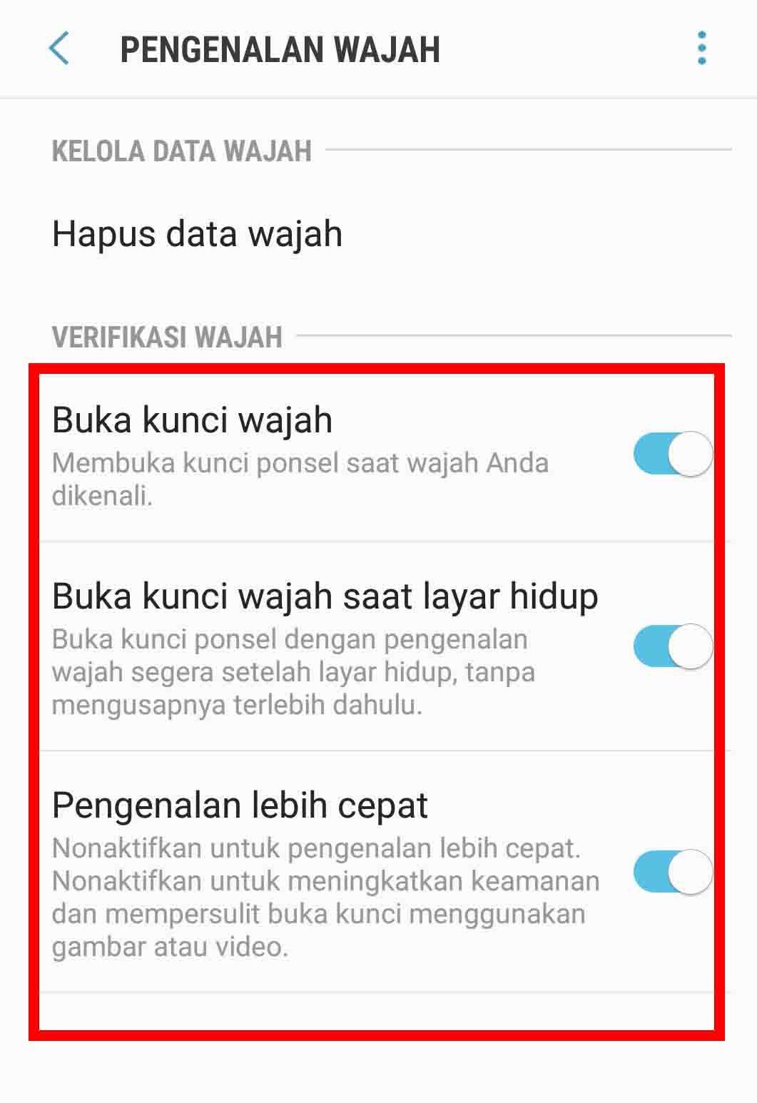 4. Jika sudah, silakan mengaktifkannya pada menu “Buka kunci wajah”, “Buka kunci wajah saat layar hidup”, dan “Pengenalan lebih cepat”.