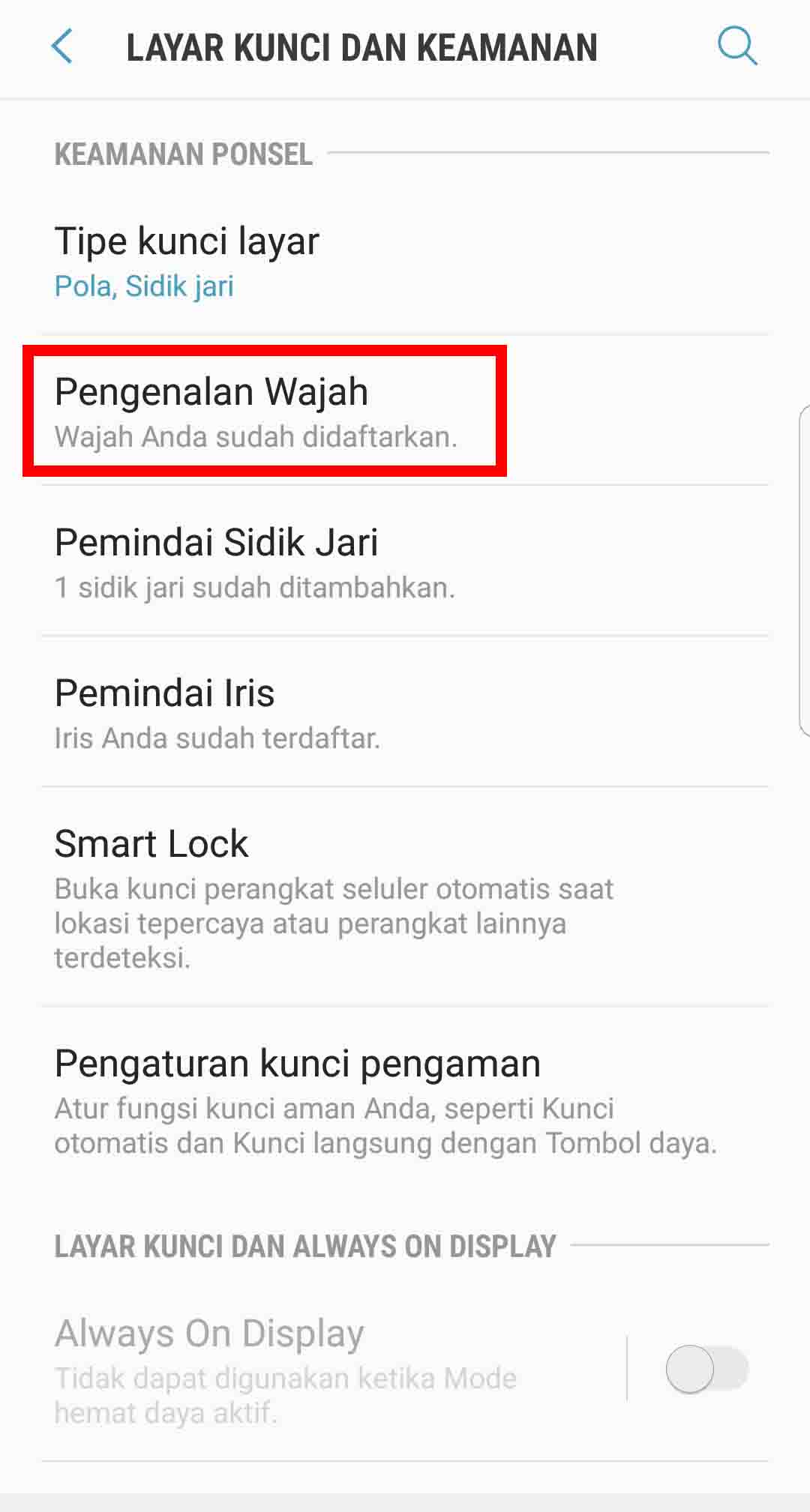 Untuk menonaktifkan face recognition: Masuk ke pengaturan – Layar kunci dan keamanan – Tipe kunci layar – Pada menu Biometrik, pilih tombol Wajah menjadi off.