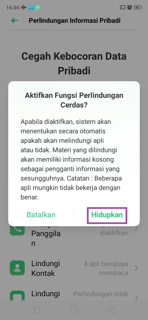 5. Sebelum perlindungan cerdas aktif, akan muncul kotak dialog yang berisikan pernyataan bahwa system secara otomatis akan menentukan akan melindungi aplikasi atau tidak, materi yang dilindungi akan kosong ketika aplikasi berusaha membaca data pribadi, serta peringatan bahwa mungkin ada beberapa aplikasi yang tidak bekerja dengan benar. Pilih ‘Hidupkan’ bila setuju.