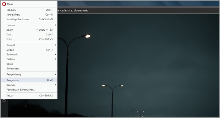 2. Klik logo Opera di pojok kiri atas dan pilih pengaturan.