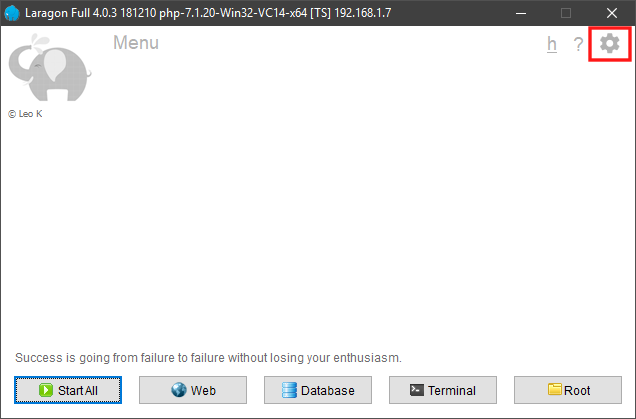 1. Buka aplikasi Laragon. Lalu, klik logo gir (Preferences) yang berada di bagian kanan atas aplikasi, untuk mengakses pengaturan umum pada aplikasi terkait. Kita juga bisa mengakses opsi preferences dengan cara klik kanan pada mouse, lalu memilih opsi preferences.