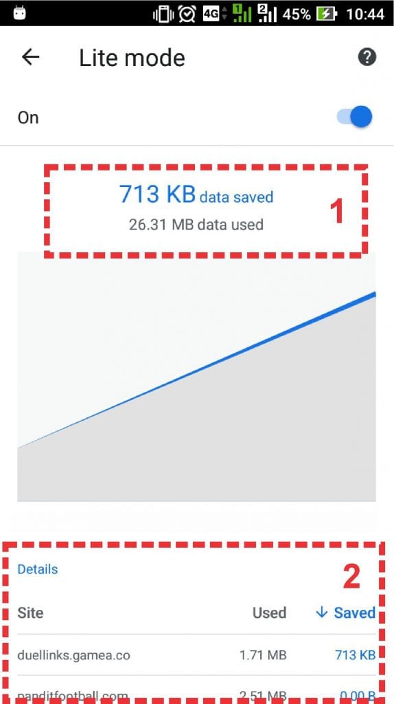 Catatan: disini penulis sudah mencoba fitur ini selama 5 menit dan membuka berbagai macam halaman web. Hasilnya dari 26.31 MB data yang digunakan, kita dapat menghemat data sebesar 713 kb.