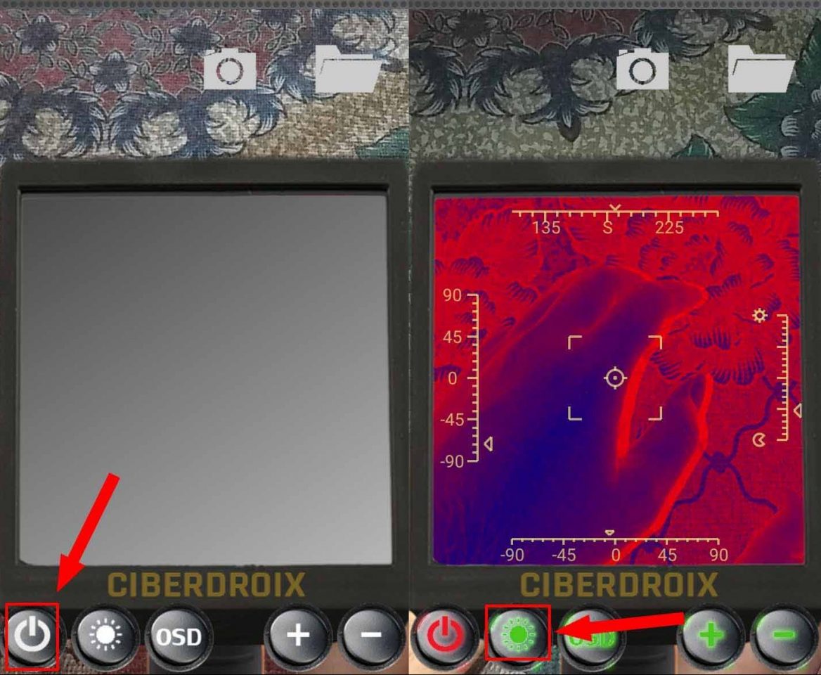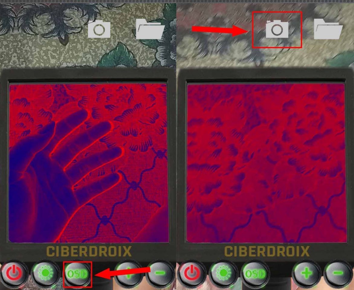 Langkah kelima, tap tombol OSD untuk menghilangkan garis bantu pada layar. Kamu juga bisa menambah ketajaman dari warna biru dan merah dengan men-tap tombol plus dan minus yang berada di sebelah kanan. Dan untuk mengambil gambar atau take picture tap pada icon kamera di bagian atas.