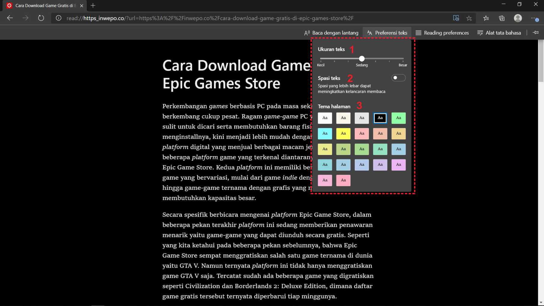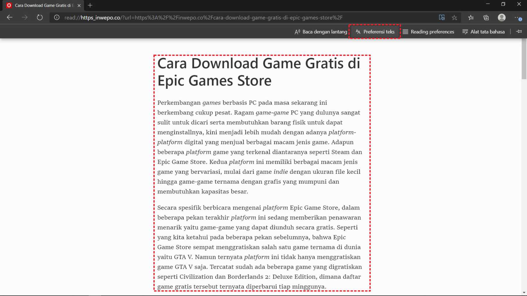 4. Maka secara otomatis, kamu akan langsung masuk ke menu mode fokus baca. Disini tampilan web yang ada menjadi lebih simpel. Klik “preferensi teks” untuk kustomisasi mode ini.