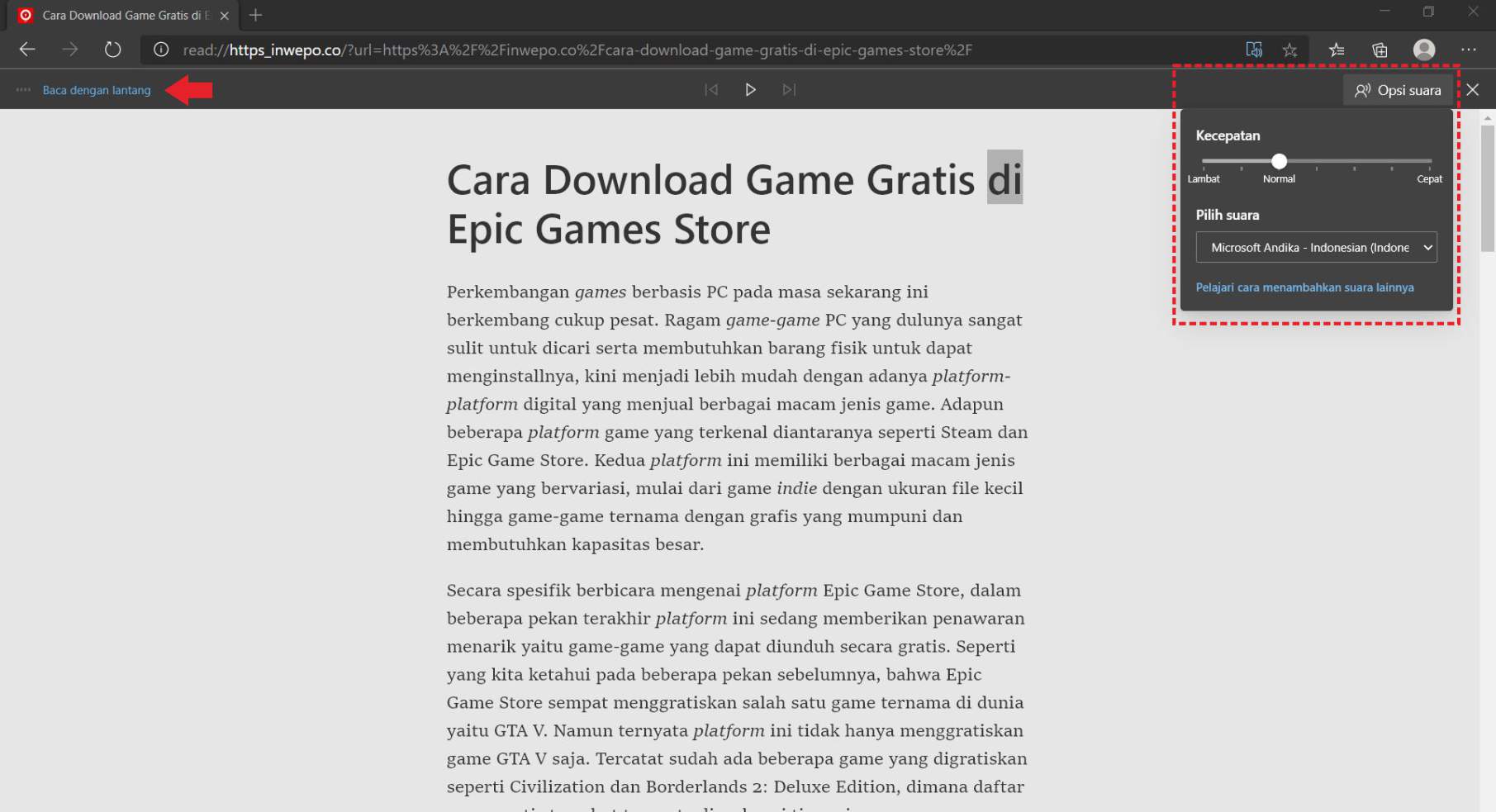 6. Untuk mengaktifkan mode suara, klik pilihan ”baca dengan lantang”. Disini kamu dapat mengatur kecepatan suara teks hingga model suara yang ingin didengar.