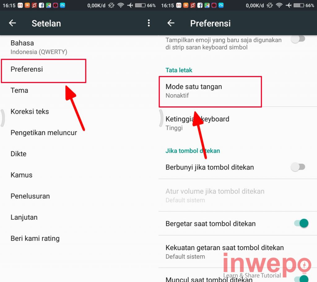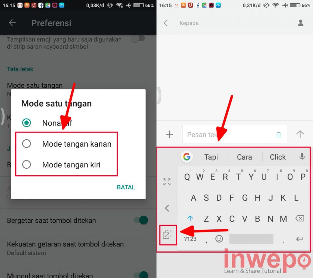 Umumnya masalah yang sering terjadi adalah kita akan kesulitan sewaktu menulis pesan menggunakan satu tangan. Sebagai alternatif kita memang bisa melakukan pengetikan menggunakan kedua tangan. Tapi hal tersebut akan jadi merepotkan sewaktu kita tengah melakukan pekerjaan atau aktivitas lainnya. Untuk itu kali ini inwepo akan berbagi tips dan cara menggunakan Google Keyboard hanya dengan satu tangan atau mengaktifkan one hand mode.