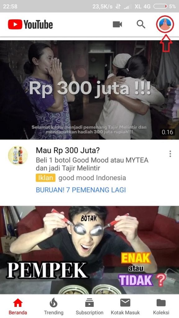 2. Pada beranda Youtube, masuk ke akun kamu, dengan cara menekan profil berbentuk lingkaran di sebelah kanan atas.