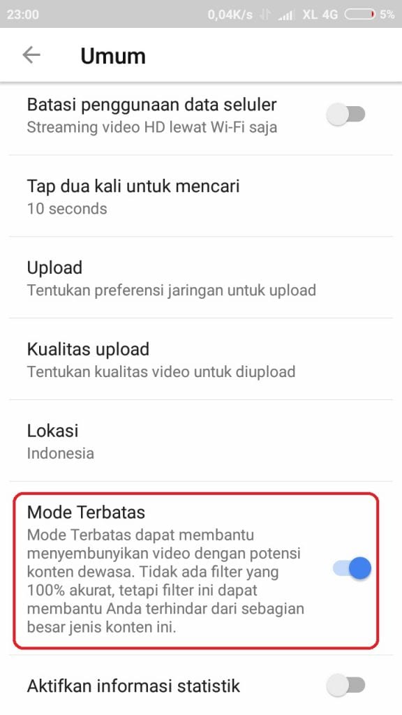 5. Scroll ke bawah sampai bertemu dengan tulisan Mode Terbatas, tekan Mode Terbatas sampai menunya bergeser ke kanan dan berubah menjadi warna biru.