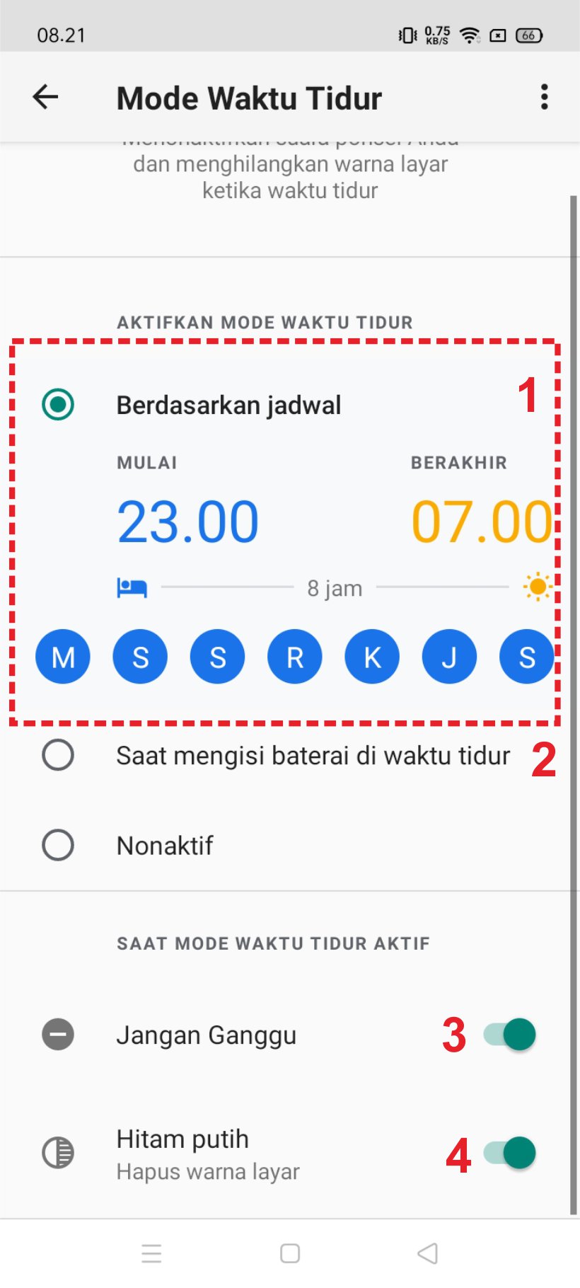 1. Berdasarkan jadwal: Mode waktu tidur diaktfikan berdasarkan jadwal yang dapat kita kustomisasi.