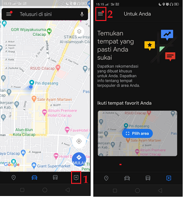 2. Klik ikon + yang ada dipojok kanan bawah pada menu Google Maps. Klik ikon tiga garis untuk membuka pengaturan Google Maps.