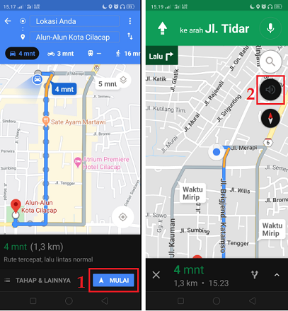 6. Kemudian secara otomatis, Google Maps akan menampilkan rute jalan tercepat. Klik tombol ‘Mulai’ untuk mulai melakukan perjalanan. Pada setiap tikungan, Google Maps akan memberi arahan belok bedasarkan arah mata angin dan menyebutkan juga nama jalan yang harus dilalui. Untuk mematikan suara navigasi, klik ikon ‘Suara’ yang ada disebelah kanan peta dan klik ikon ‘Mute’.