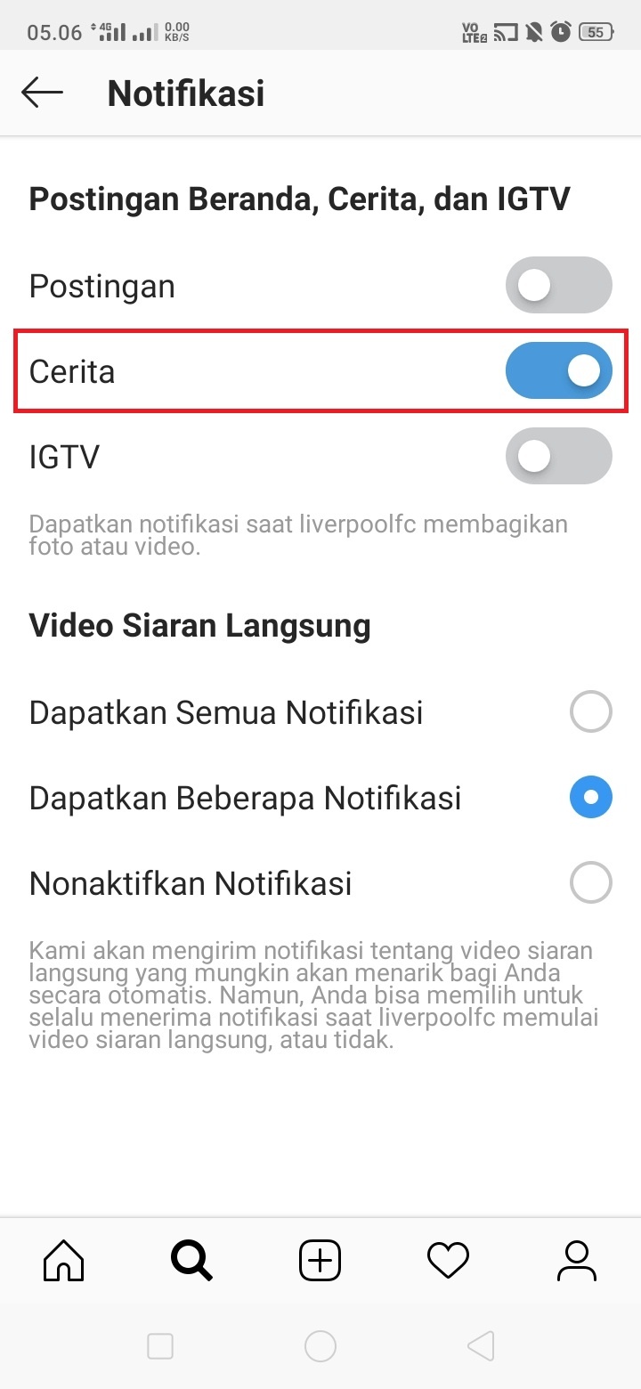 6. Aktifkan notifikasi untuk ‘Cerita’. Selain notifikasi cerita, kita juga dapat mengaktifkan notifikasi untuk postingan, IGTV, dan video siaran langsung. Pilih notifikasi sesuai dengan kebutuhan kamu.