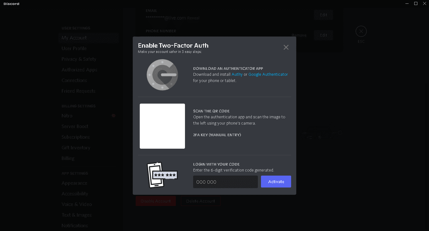 4. Setelah mengklik opsi terkait, pop-up akan muncul mengindikasikan bahwa kamu harus mendapatkan kunci verifikasi untuk mengaktifkan opsi 2FA. Lalu, buka aplikasi autentifikator kamu dan Scan QR Code (atau masukkan kunci 2FA) yang telah disediakan oleh Discord. Nantinya kamu akan kembali di minta untuk memasukkan password backup yang dikhususkan untuk autentifikator terkait.