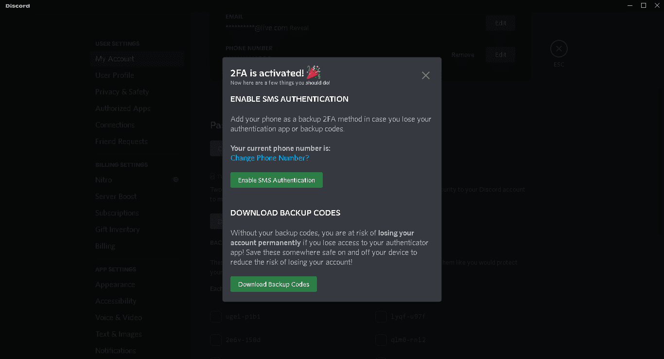 5. Jika kamu telah memasukkan kode verifikasi yang telah diminta, maka selamat! Akun kamu telah diproteksi oleh 2FA. Tentunya, kamu bisa menambahkan opsi keamanan tambahan seperti verifikasi melalui nomor telepon. Tidak lupa juga, Discord menyediakan opsi untuk mengunduh kode backup yang nantinya berlaku sebagai keamanan ganda.
