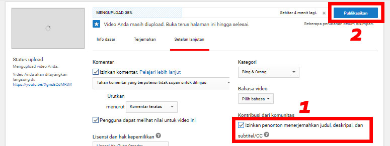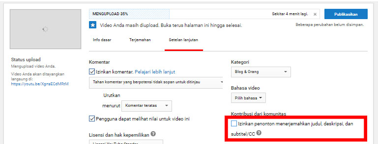 5. Selanjutnya, masuk ke setelan lanjutan dan cari tulisan ” izinkan penonton menerjemahkan judul, deskripsi dan subtitle/cc”.