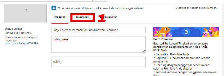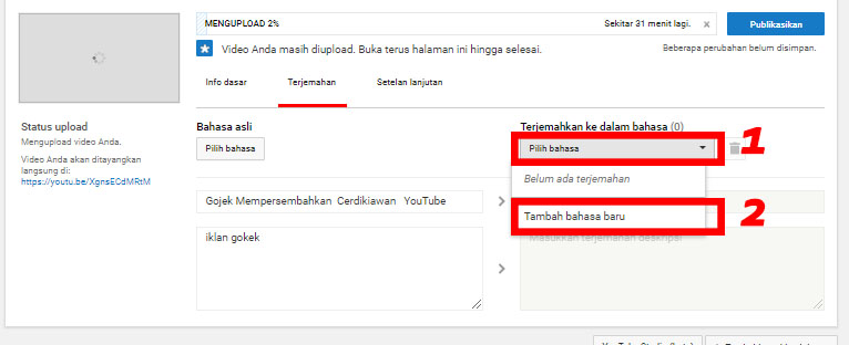 2. Saat muncul halaman proses upload video, isi info dasar dari video yang kamu unggah sesuai kebutuhan kamu. Selanjutnya, pilih opsi Terjemah yang ada di samping info dasar.