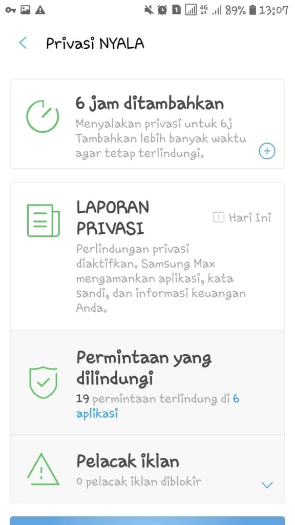 Perlindungan privasi pada samsung max hanya mampu bertahan otomatis selama enam jam dari awal diaktifkan. Maka selanjutnya jika ingin menambahkan banyak waktu: