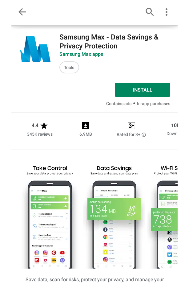 Salah satu perusahaan asal Korea Selatan, Samsung mengeluarkan aplikasi pengamanan android mereka yaitu Samsung Max. Samsung Max berfungsi memblokir penggunaan data background yang sering menghabiskan kuota. Aplikasi ini juga memberikan Privacy Protection Mode untuk enkripsi, tracker blocking dan DNS masking service. di sisi lain, Samsung Max juga merupakan aplikasi penyimpanan data dari Samsung yang juga menawarkan VPN gratis untuk melindungi navigasi.