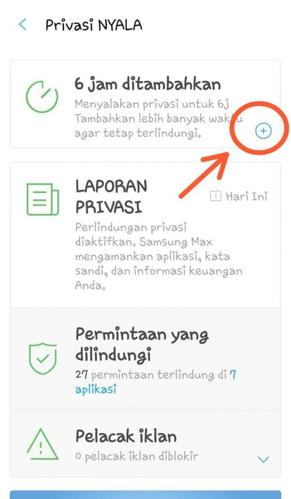 2. Lalu klik ikon plus di atas maka secara otomatis waktu perlindungan privasi pada Android kamu akan bertambah enam jam kemudian (batas 24 jam).