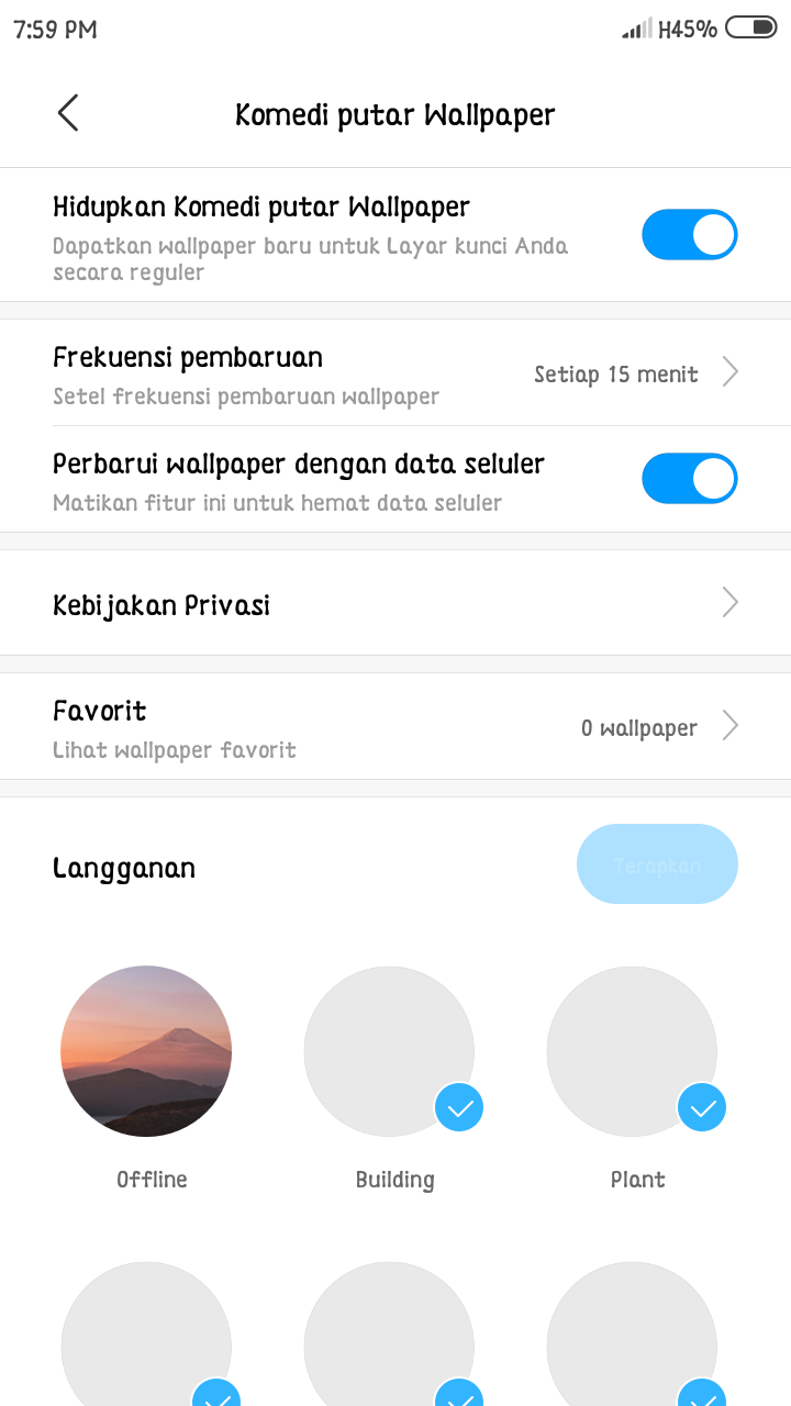 Di pengaturan ini kamu bisa mengatur berapa lama jangka waktu untuk penggantian wallpaper, penggunaan data seluler, dan juga ada berbagai macam tema wallpaper seperti building, plant, food dan masih banyak lagi.