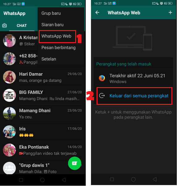 1. Buka aplikasi WhatsApp di perangkat Android atau IOS kamu. Klik ikon titik tiga di pojok kanan atas. Pilih fitur WhatsApp Web. Aplikasi akan menampilkan riwayat digunakan. Klik tombol ‘Keluar dari semua perangkat’ untuk keluar dari semua perangkat dimana WhatsApp Web pernah masuk.