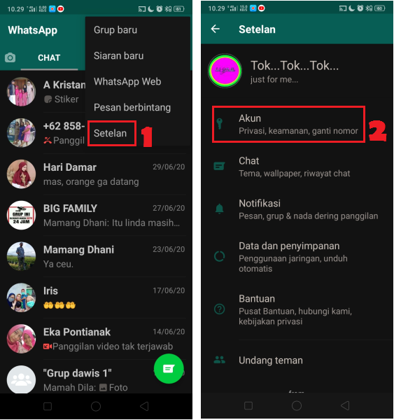 1. Buka aplikasi WhatsApp di perangkat Android atau IOS kamu. Klik ikon titik tiga di pojok kanan atas. Pilih fitur Setting. Pilih menu ‘Akun’.