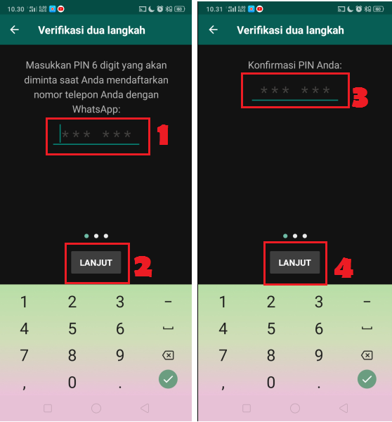 3. Buat pin baru dengan panjang karakter 6 digit, dan klik tombol lanjut. Konfirmasi pin yang baru saja dibuat, dan klik tombol lanjut.