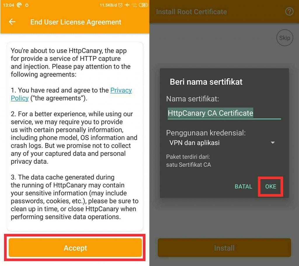 Saat pertama kali kamu membuka HttpCanary kamu akan di hadapkan dengan jendela Lisensi, klik Accept untuk melanjutkan. Selanjutnya kamu akan diminta mengaktifkan VPN, klik OK. Setelah itu ada jendela “Install Root Certificate“, klik Install.